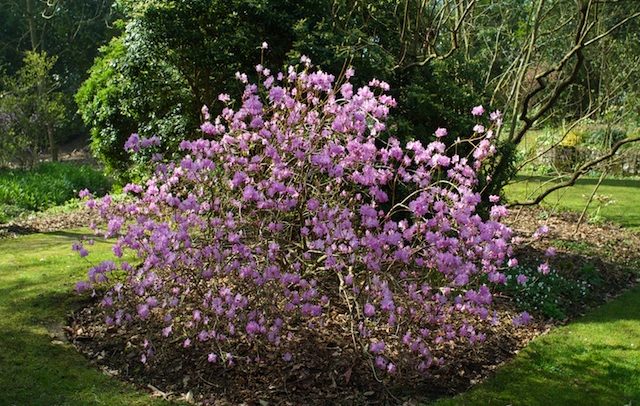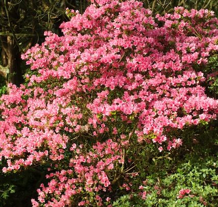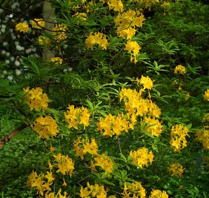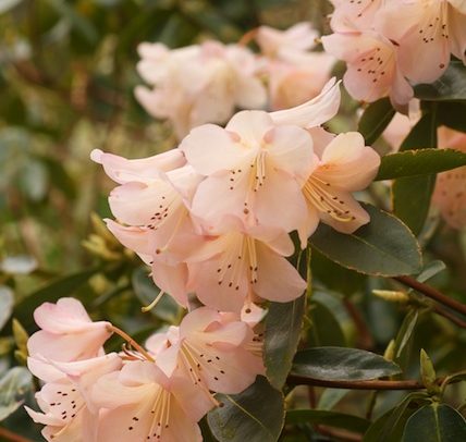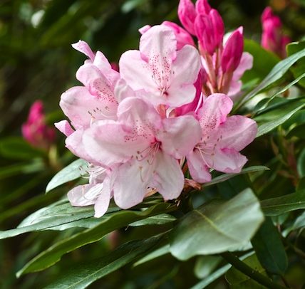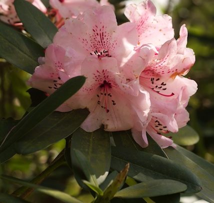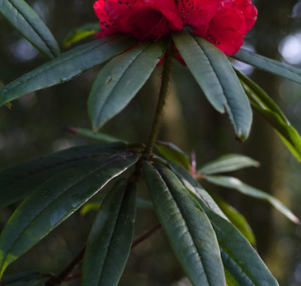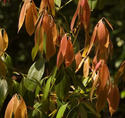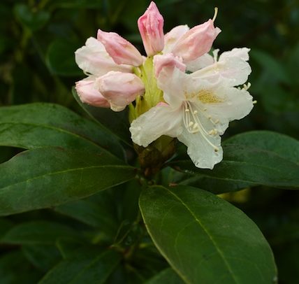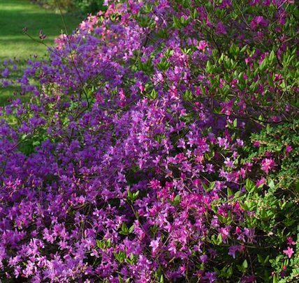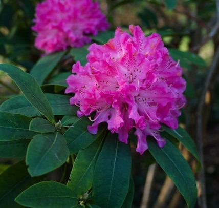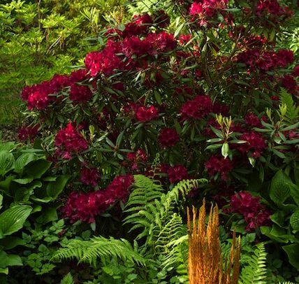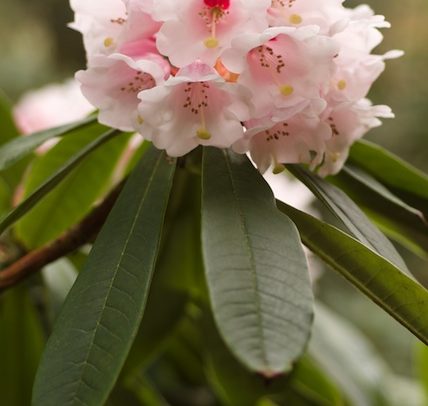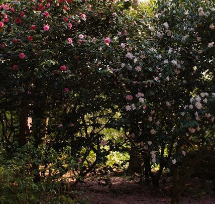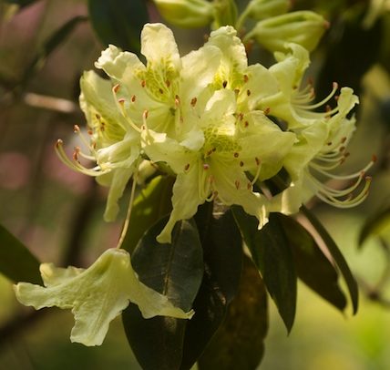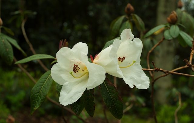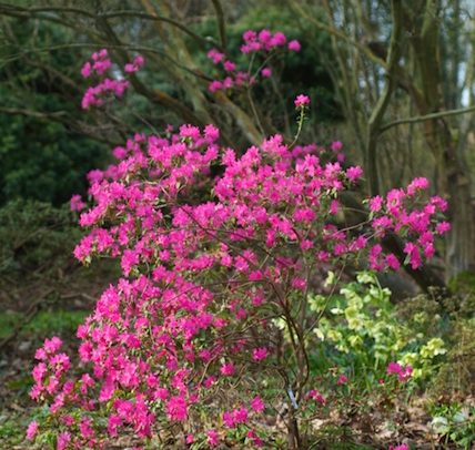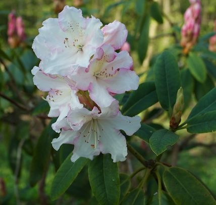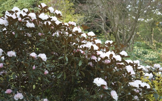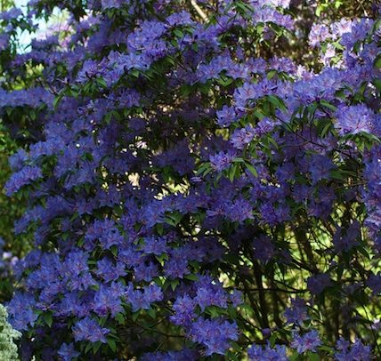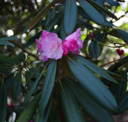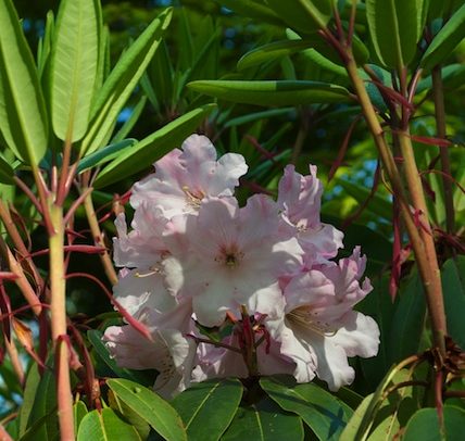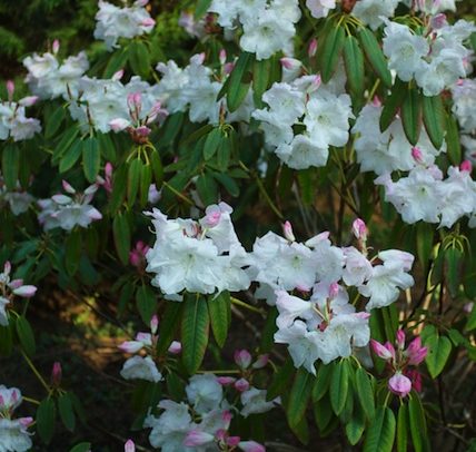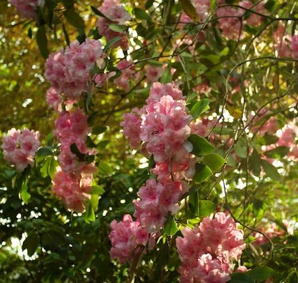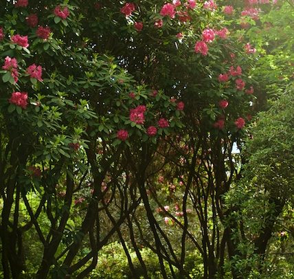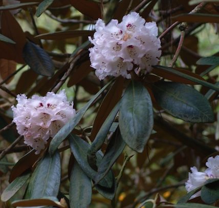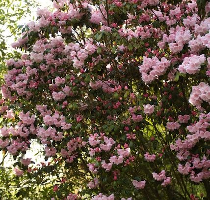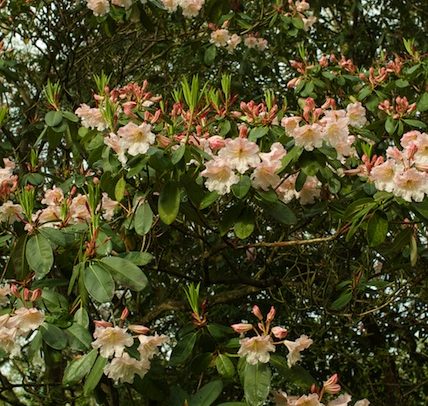 Un bois entier leur est consacré. Il y a plus de 700 sujets, certains dépassant 8 à 10 mètres de hauteur et montrant outre leur floraison spectaculaire, des graphismes de troncs et d’écorces remarquables toute l’année. Les feuillages ne sont pas en reste, surtout chez les rhodos à grandes feuilles ( R.rex, R. fictolacteum, R.hodgsonii,…) ou les couleurs d’automne des nombreuses azalées qui les accompagnent. De nombreuses haies du jardin sont constituées de rhododendrons pontiques, tous issus de semis sélectionnés par la Princesse, et tous différents. Les premiers rhodos fleurissent en décembre (‘Christmas Cheer’) et les dernières fleurs de ‘Polar Bear’ tombent fin septembre.