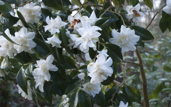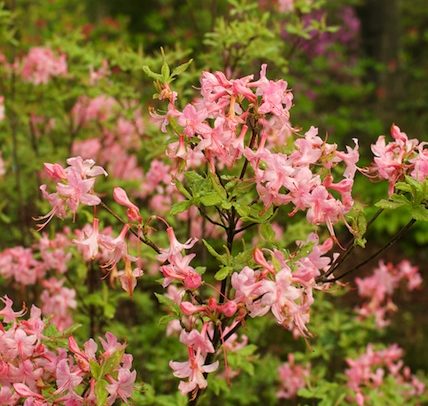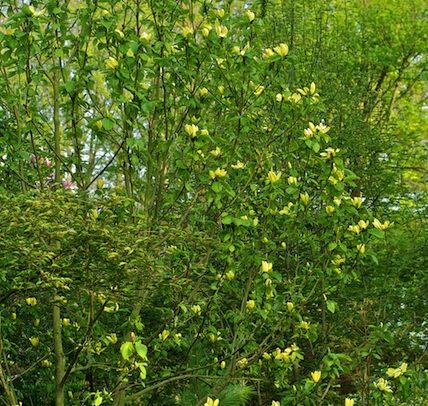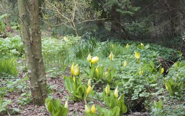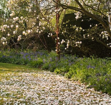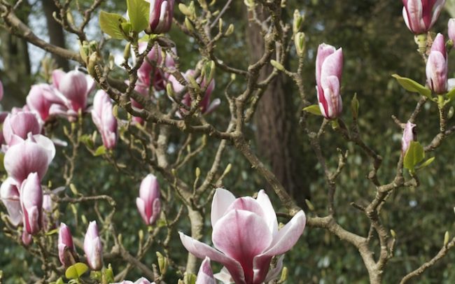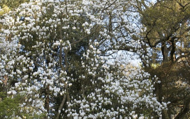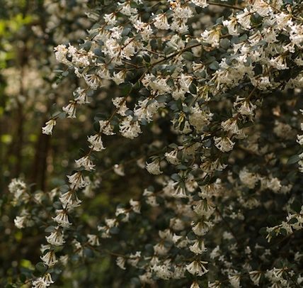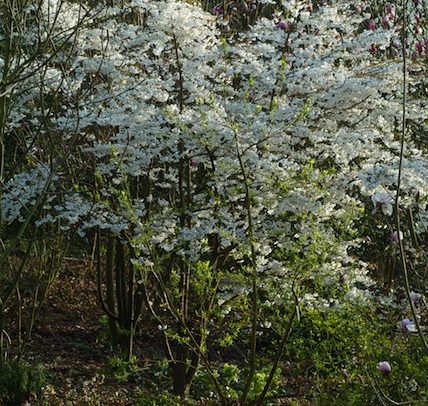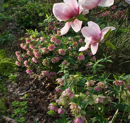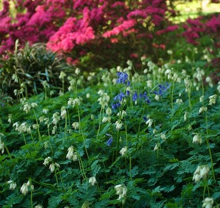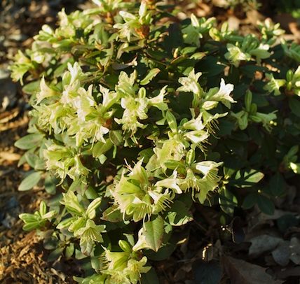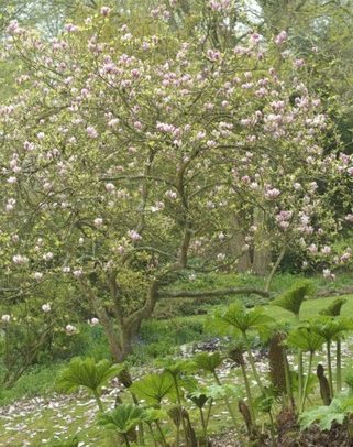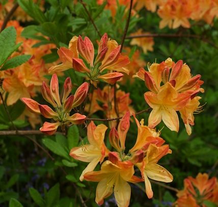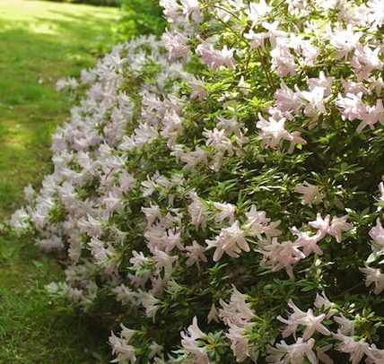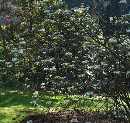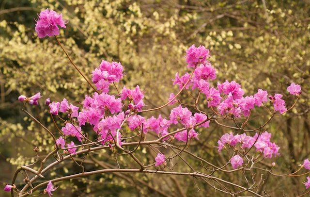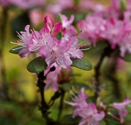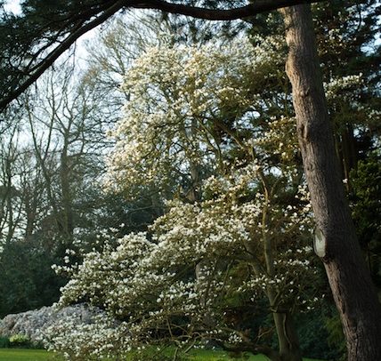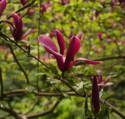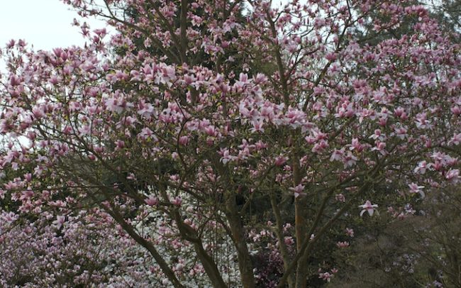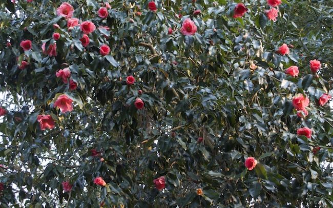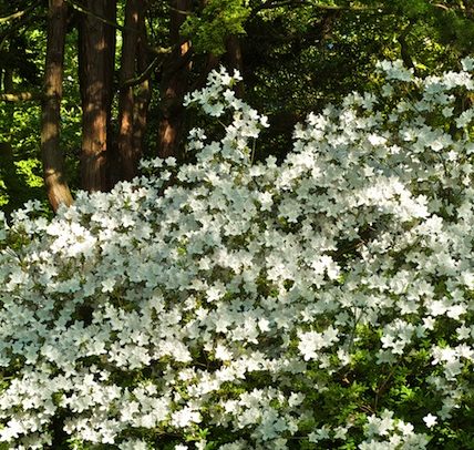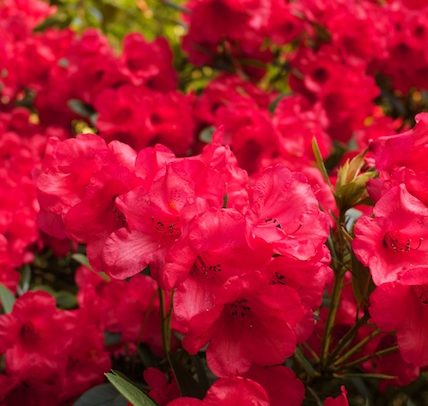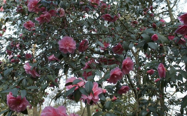 Un bois entier leur est consacré. Il y a plus de 700 sujets, certains dépassant 8 à 10 mètres de hauteur et montrant outre leur floraison spectaculaire, des graphismes de troncs et d’écorces remarquables toute l’année. Les feuillages ne sont pas en reste, surtout chez les rhodos à grandes feuilles ( R.rex, R. fictolacteum, R.hodgsonii,…) ou les couleurs d’automne des nombreuses azalées qui les accompagnent. De nombreuses haies du jardin sont constituées de rhododendrons pontiques, tous issus de semis sélectionnés par la Princesse, et tous différents. Les premiers rhodos fleurissent en décembre (‘Christmas Cheer’) et les dernières fleurs de ‘Polar Bear’ tombent fin septembre.