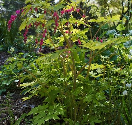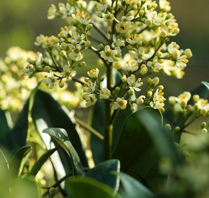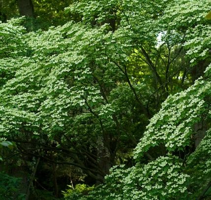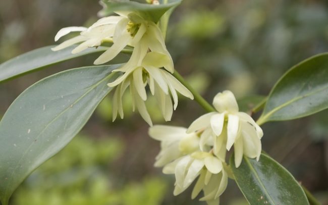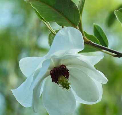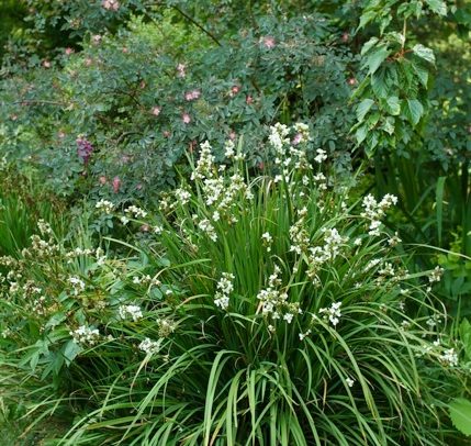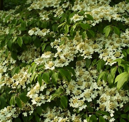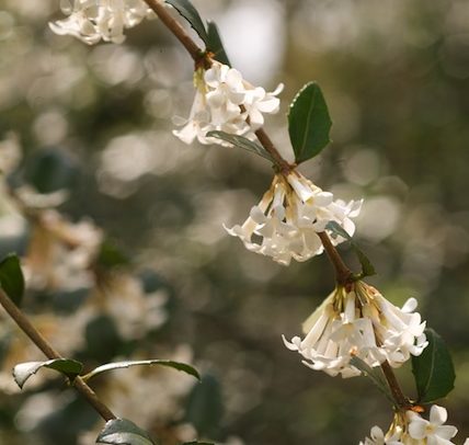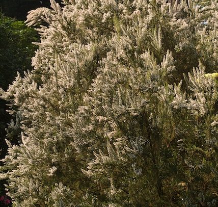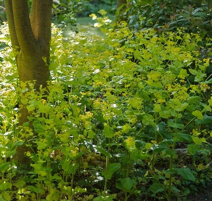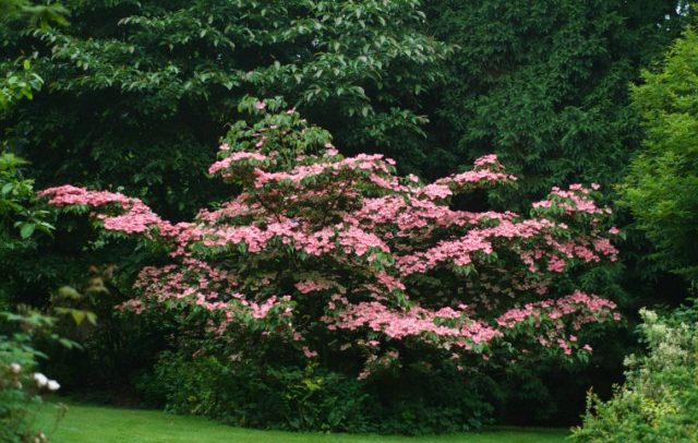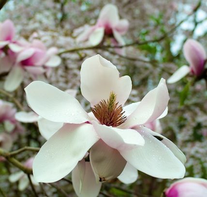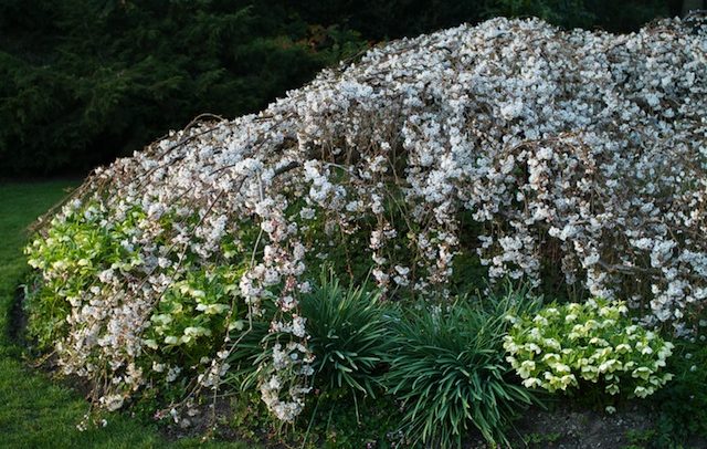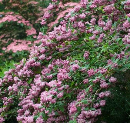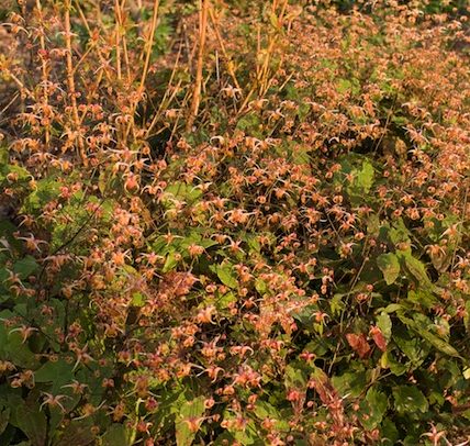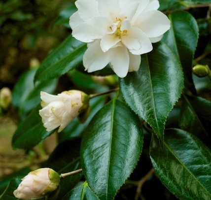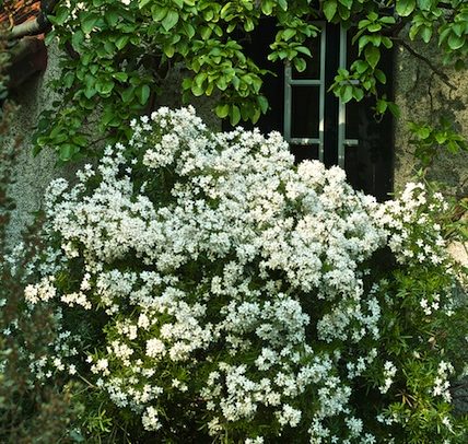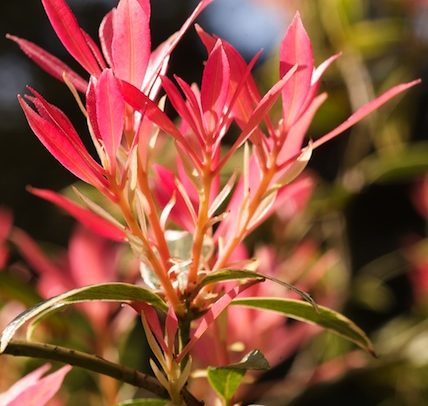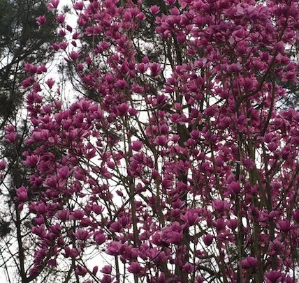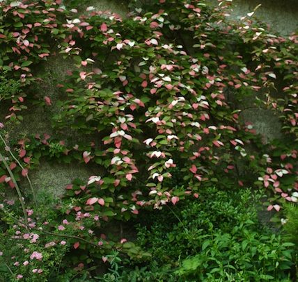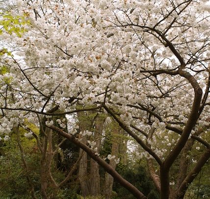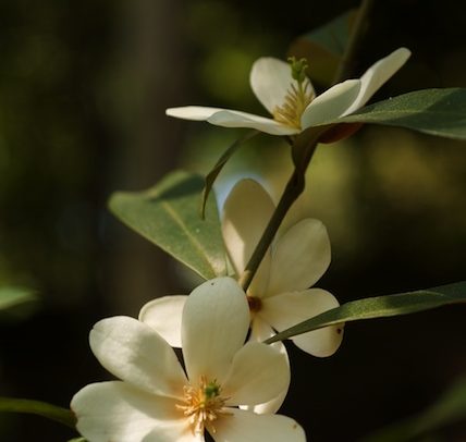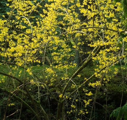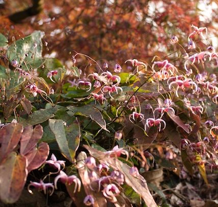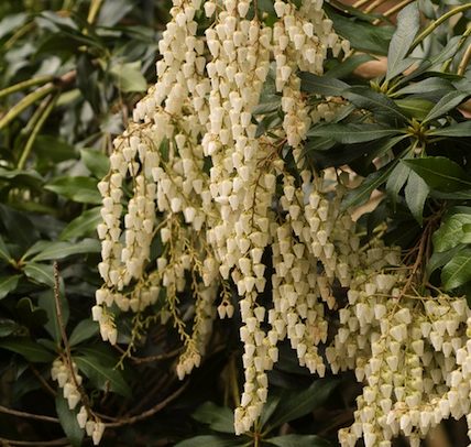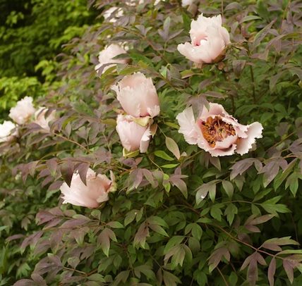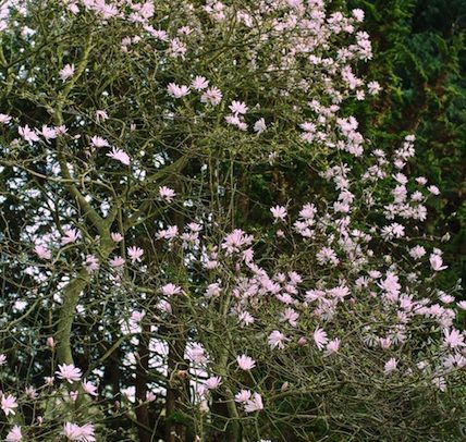 Un bois entier leur est consacré. Il y a plus de 700 sujets, certains dépassant 8 à 10 mètres de hauteur et montrant outre leur floraison spectaculaire, des graphismes de troncs et d’écorces remarquables toute l’année. Les feuillages ne sont pas en reste, surtout chez les rhodos à grandes feuilles ( R.rex, R. fictolacteum, R.hodgsonii,…) ou les couleurs d’automne des nombreuses azalées qui les accompagnent. De nombreuses haies du jardin sont constituées de rhododendrons pontiques, tous issus de semis sélectionnés par la Princesse, et tous différents. Les premiers rhodos fleurissent en décembre (‘Christmas Cheer’) et les dernières fleurs de ‘Polar Bear’ tombent fin septembre.